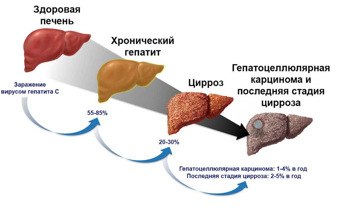Вирусный гепатит С протекает, как в острой, так и хронической форме. Наиболее опасным считается хронический вариант заболевания, поскольку долгое время он остается незамеченным. Примерно у 20% инфицированных в течение полугода после заражения наступает спонтанное излечение. У остальных 80% болезнь переходит в хроническую стадию, что грозит серьезными осложнениями, вплоть до смерти⁴.
