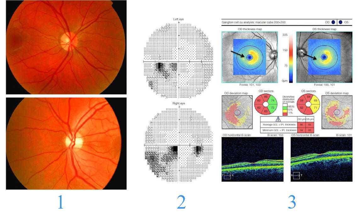 Рис.2 Признаки ЧАЗН на 1 — офтальмоскопии (бледные диски), 2 — периметрии (выпадение полей зрения) и 3 — ОКТ (отической когерентной томографии)