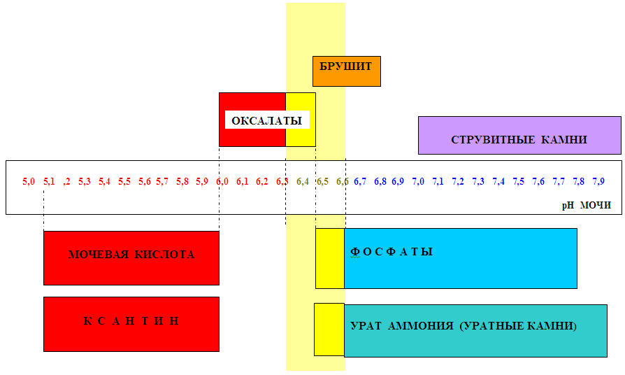 В моче присутствует множество солей в растворенном виде. Изменение ее кислотности приводит к снижению растворимости солей, они начинают образовывать кристаллы и выпадать в осадок. Аморфные фосфаты перестают быть растворимыми при рН больше 8,0.К повышению водородного показателя мочи приводят: