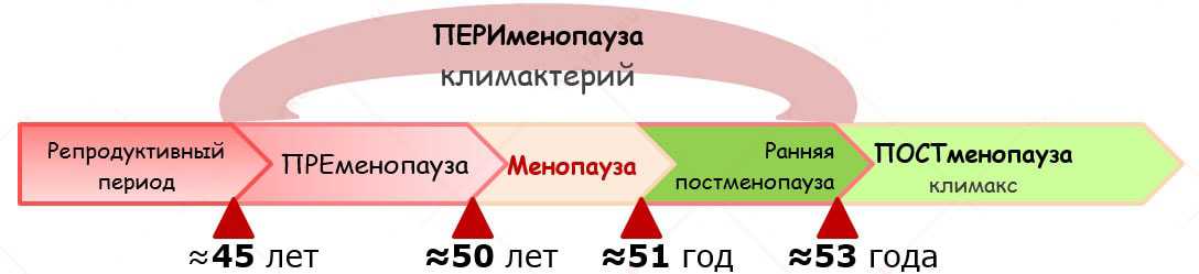 Средний возраст наступления менопаузы во всем мире составляет 48,8 лет со значительными колебаниями этого показателя в зависимости от географического региона проживания женщин. В России он колеблется от 49 до 51 года. Выделяют преждевременную менопаузу (до 40 лет), раннюю (40–44 лет), своевременную (45–55 лет) и позднюю (старше 55 лет).