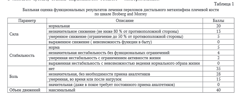 В то же время, система оценки результатов лечения больных с переломами дистального суставного конца плечевой кости, описанная Casselbaum в модификации Jupiter J.B. и соавт. (1985), более проста для применения в клинической прарактике, но более субъективна.