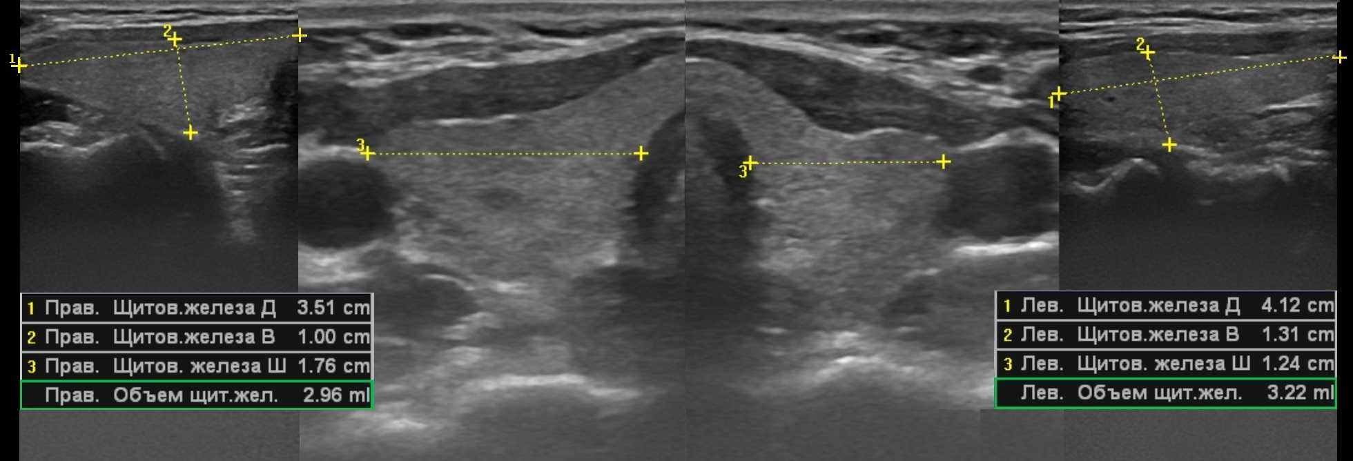 Если тиреоидный объем больше нормы — это гиперплазия, а если меньше нормы — гипоплазия. Когда объем железы у верхней границы нормы, учитывают передне-задний размер перешейка: если перешеек более 3 мм до 10 лет или более 5 мм после 10 лет, то железу признают увеличенной.