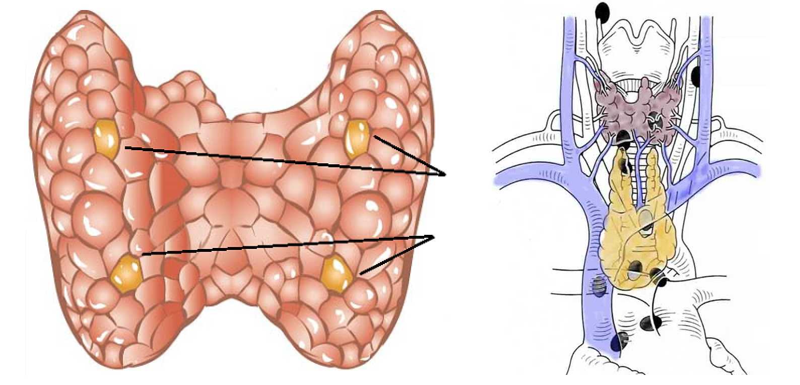 Паращитовидные железы располагаются на задней поверхности щитовидной железы вне ее капсулы около верхнего и нижнего полюсов, имеют округлую форму, диаметр до 5 мм. Как и щитовидная железа, они происходят из кишечной трубки. Обычно у человека четыре паращитовидные железы (две верхние и две нижние). Иногда встречаются добавочные паращитовидные железы в ткани щитовидной и вилочковой желез, в переднем и заднем средостении, в перикарде, позади пищевода, в области бифуркации общей сонной артерии. Паращитовидные железы кровоснабжают ветви нижней щитовидной артерии. Только в 10% случаев артерии для верхних железок отходят от верхней щитовидной артерии.