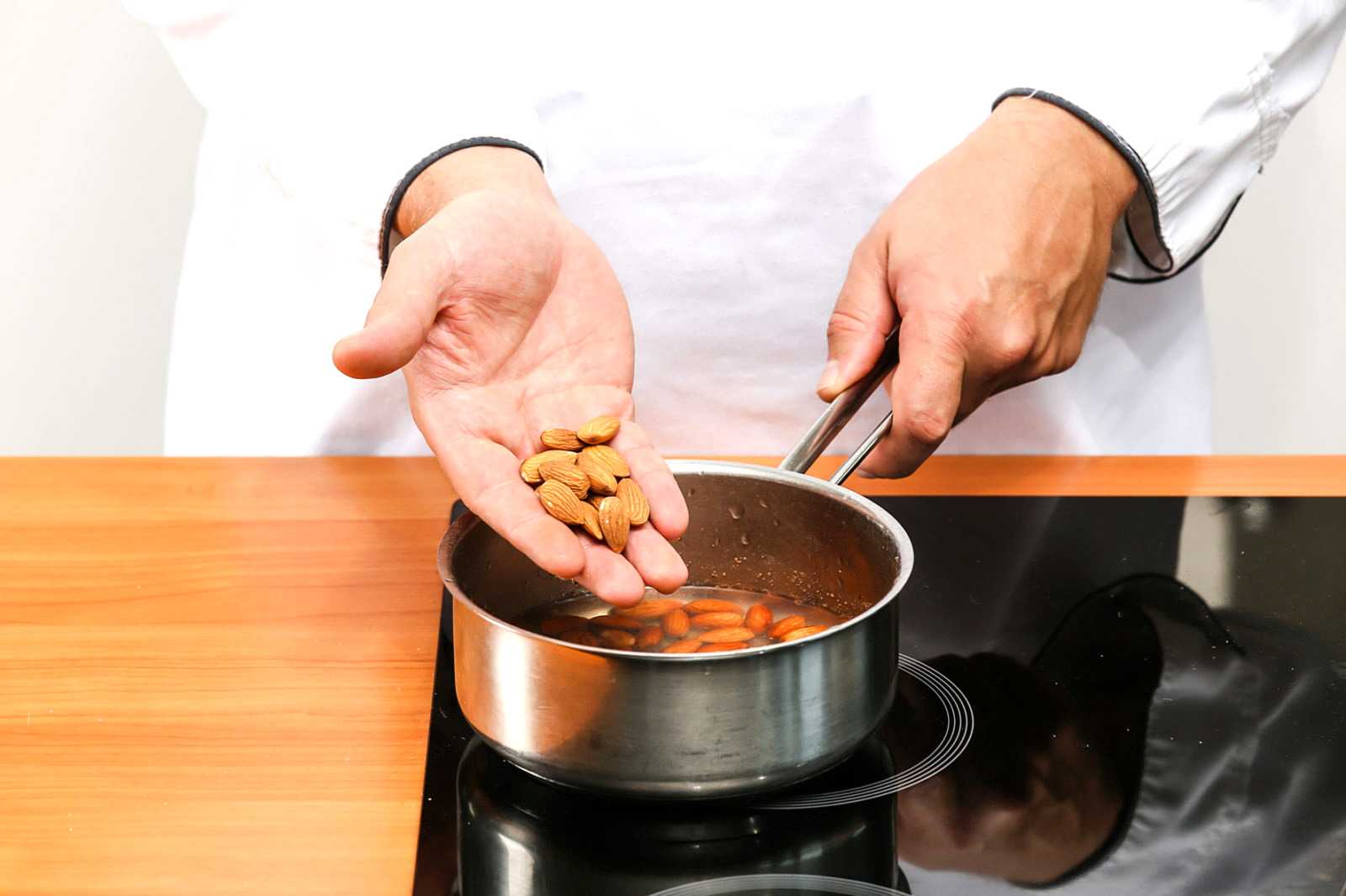 - Для начала миндаль нужно очистить от кожуры. Если начать это делать, то сдаться очень быстро, так как просто так миндаль не очистится. Для этого мы должны опустить его в кипящую воду и варить на медленном огне не менее двух минут.