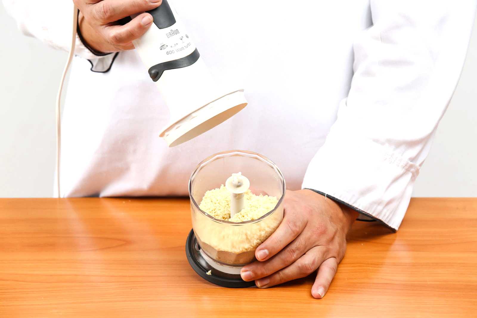 - Далее, мы берём блендер и высыпаем в него наш миндаль. Используем медленную скорость для измельчения орехов и превращения их в кашу, похожую на пюре.