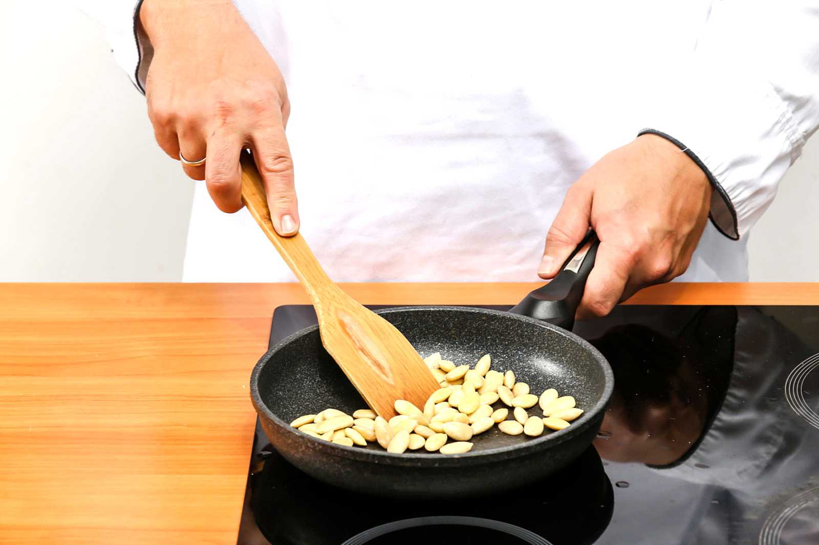 подвергая миндаль тепловой обработке на сковороде, нельзя допускать зажаривания продукта. Ингредиент должен лишь подсохнуть, но ни в коем случае не зарумяниться.