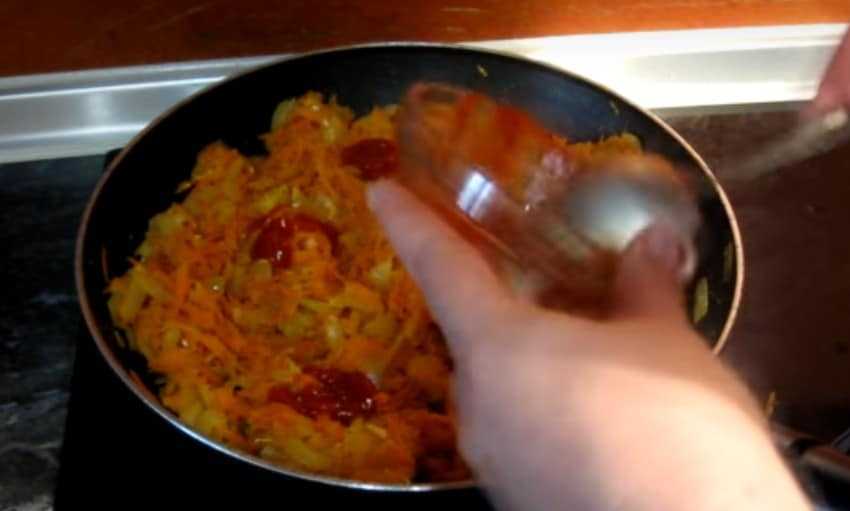 5. Влейте в сковороду томатный соус и обжаривайте, постоянно помешивая, 4-5 минут.