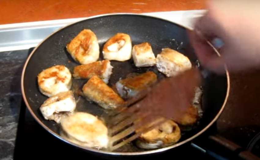 3. Разогрейте сковородку с маслом, обжарьте кусочки с двух сторон до золотистой корочки, переложите в кастрюлю.